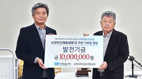 [한라일보] 제주테크노파크(제주TP) 청정바이오사업본부 생물종다양성연구소는 지난달 28일 서귀포시 남원읍 신례1리마을회 다목적회관에서 신례리공동목장(조합장 양춘식) 조합원과 주요 관계자들이 참석한 가운데 발전기금 1000만원을 전달했다. 발전기금은 신례리공동목장조합의 노후 시설 개선과 마을 우수학생 장학금 출연 등에 쓰일 예정이다.