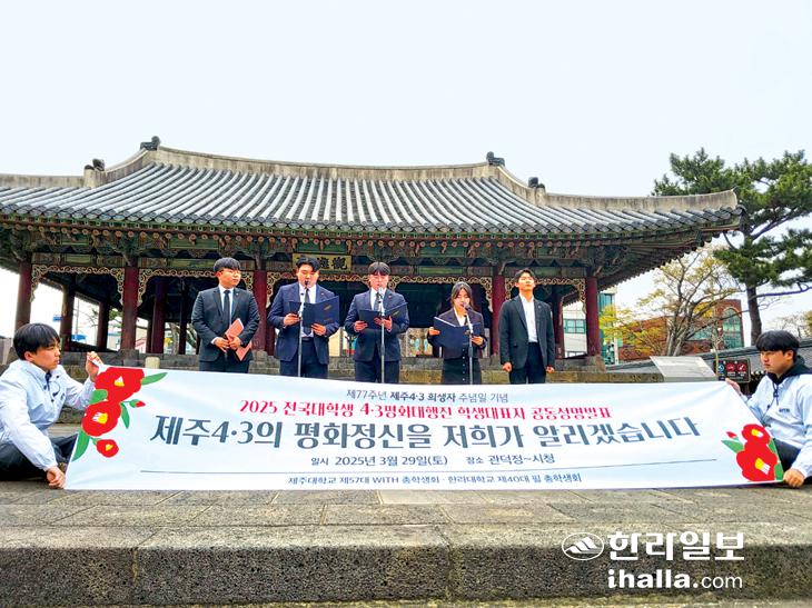 지난 29일 오후 제주시 원도심 관덕정 앞. 제주4·3의 역사적 현장인 그곳에서 제주 지역 대학교 총학생회와 전국국공립대학생연합회 의장단이 4·3에 대한 미군정의 책임 규명과 사과 촉구, 극우 단체의 4·3 망언 중단과 4·3왜곡 처벌법 제정 등을 요구하며 공동 선언문을 발표했다. 160여 명의 참석자들은 선언문 낭독 뒤 제주시청까지 '전국대학생 4·3평화대행진'을 벌였다.