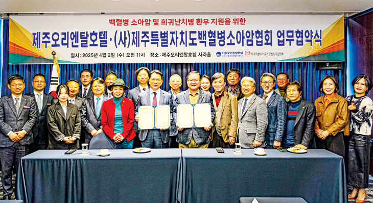 제주특별자치도백혈병소아암협회(협회장 손태일)은 지난 2일 제주오리엔탈호텔(대표이사 정수영)과 백혈병, 소아암 및 난치병 환우 및 취약계층 어린이 지원을 위한 업무협약식을 개최했다.