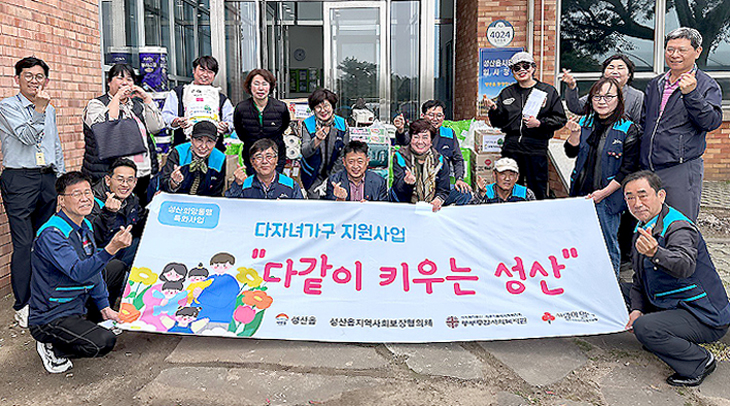 서귀포시 성산읍지역사회보장협의체(공동위원장 김경범·오상윤)는 지난 17일 다자녀 지원사업 '다 같이 키우는 성산'의 일환으로 53가구에 물품을 지원했다.