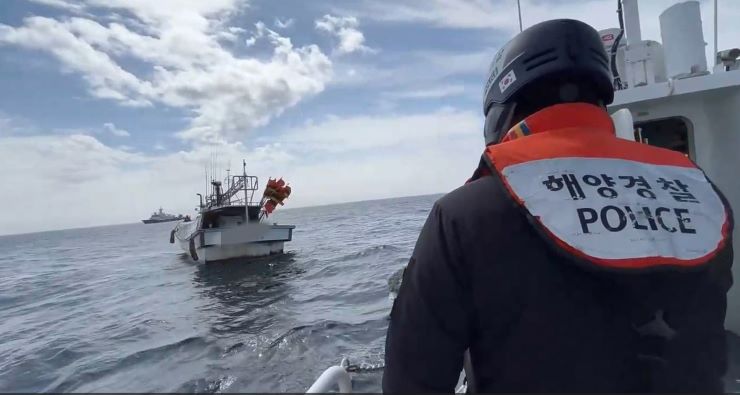 23일 오전 서귀포시 성산항 남동쪽 약 13㎞ 해상에서 불이 난 어선 A호가 신양항으로 예인되고 있다. 서귀포해양경찰서 제공
