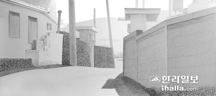 삼양(三陽)의 뜻하는 세 개의 햇살을 찾아 마을 가름들을 돌아다니다가 해무가 살짝 밀려오는 오후 삼양3동에서 만난 눈부신 햇살. 天·地·人 세 곳에 모두 자리 잡은 저 길이 빛나고 있었기에 그렸다. 사람이 모여 살아가는 길. 집과 집 사이에 난 저 길은 얕은 높낮이가 그대로 유지된 그런 길이다. 그래서 더욱 정겹게 햇살을 받아 반사하고 있다. 거대한 변화의 물결 속에서도 소박한 삶의 모습을 그대로 간직한 사람들의 길이 이토록 눈부신 것은 하늘의 빛이 집이라고 하는 사람의 빛을 통해 땅에 전달되는 세 개의 볕, 삼양을 의미하는 것은 아닐까 생각하며 오후 네 시의 시간성을 담아내려 했다. 마을 이름이 삼양이라서 더욱 빛에 탐닉하게 되는 것은 당연한 회화적 도전이라 생각했기에 색채를 빼고 연필에 의한 명도를 가지고 빛을 표현했다. 옛 돌담과 시멘트 블록담장이 좌우에서 마주 보며 변하지 않은 그 무엇에 대해 대화하는 분위기다.