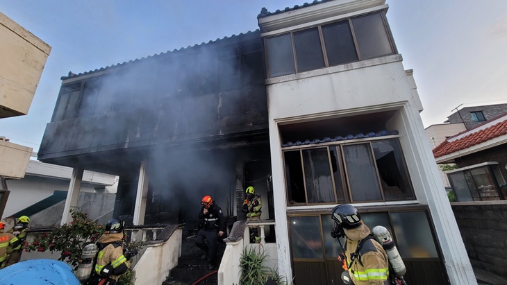 제주시 연동 소재 한 단독주택에서 화재가 발생해 5명이 전원 대피했으나 1명이 연기를 흡입해 병원으로 이송됐다. 제주도소방안전본부 제공