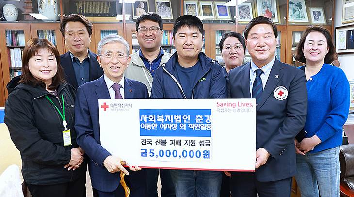 사회복지법인 춘강(이사장 이동한)은 최근 대한적십자사제주특별자치도지사(회장 정태근)에 국내 산불 구호 성금 500만원을 기탁했다.