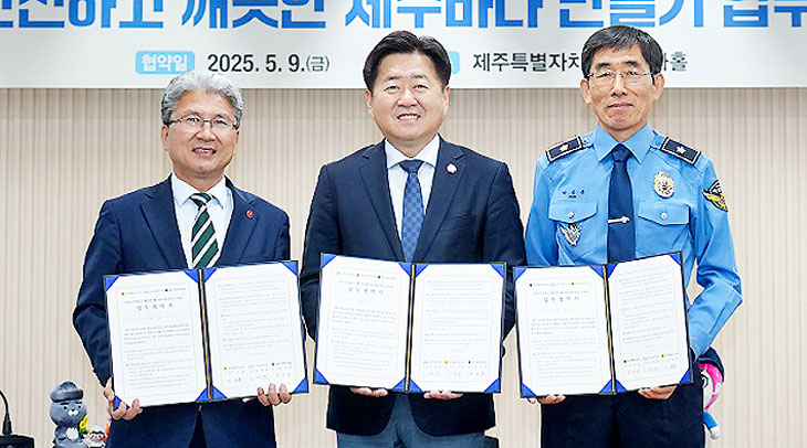 제주특별자치도와 제주도의회, 제주지방해양경찰청은 지난 9일 도청 삼다홀에서 '더욱 안전하고 깨끗한 제주바다 만들기 위한 업무협약'을 체결했다.
