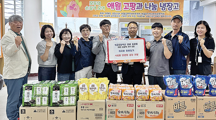 제주시 애월읍 곽금초등학교 33회 동창회(회장 장용택)는 지난 28일 애월읍사무소(읍장 김태헌)를 방문해 어려운 이웃에게 전달해달라며 50만원 상당의 식료품을 후원했다.
