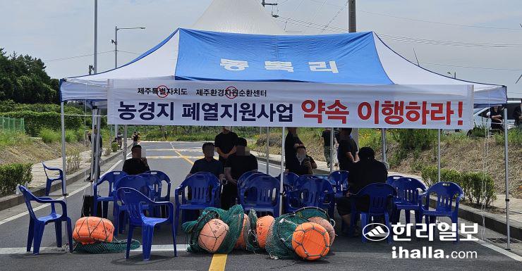 동복리 마을회는 마을이 제주환경자원순환센터를 유치할 당시 제주도가 약속했던 농경지 폐열지원사업을 이행하지 않고 있다며 7일 오전부터 센터 진입로를 막아서고 있다. 문미숙기자