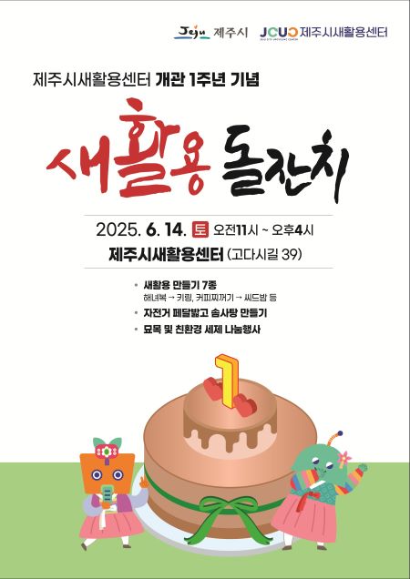 제주시는 이달 14일(오전 10~오후 4시) 제주시 새활용센터에서 1주년 기념행사를 열고, 새활용(Upcycling)의 가치를 시민들에게 널리 알리기 위한 가족 참여형 축제의 장을 마련한다고 8일 밝혔다.