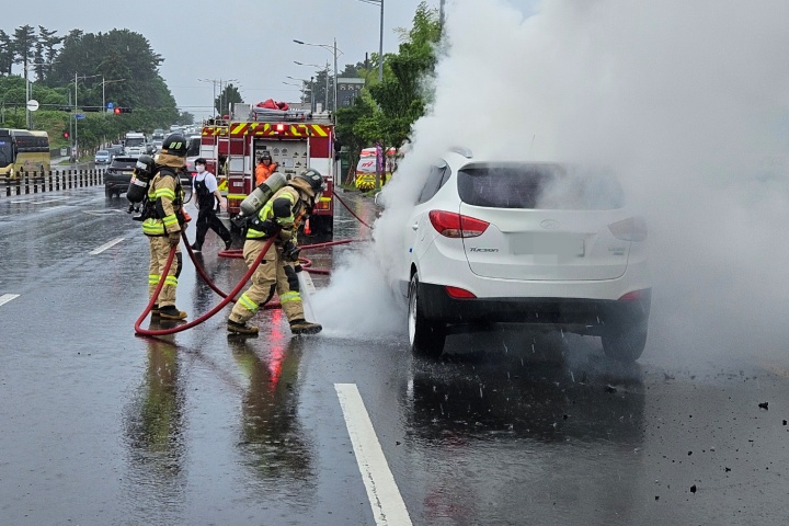16일 오전 8시 57분쯤 제주시 도남동 연북로에서 달리던 차량에서 불이나 소방이 진압하고 있다. 제주도소방안전본부 제공.