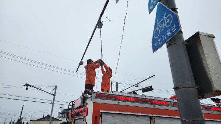 16일 오전 9시 22분쯤 제주시 구좌읍 한동리에서 강풍으로 신호등 와이어가 길게 늘어져 있다는 신고가 접수됐다. 제주도소방안전본부 제공.