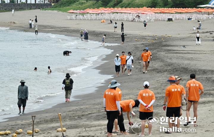 24일 개장한 이호테우해수욕장에서 관광객과 안전요원들이 해변을 거닐고 있다. 강희만 기자