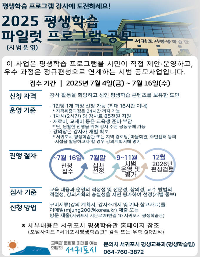 [한라일보] 서귀포시는 시민이 직접 참여하는 평생학습 기반을 넓히기 위해 '2025년 서귀포시 평생학습관 파일럿 과정 공모'를 4일부터 이달 16일까지 진행한다고 3일 밝혔다.