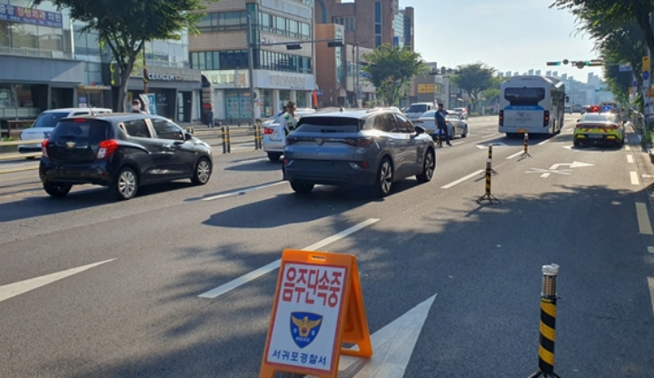 3일 오전 서귀포경찰서와 제주도자치경찰단이 서귀포시 서귀동 중앙로터리에서 음주단속을 벌이고 있다. 서귀포경찰서 제공