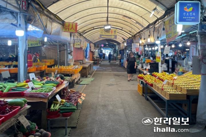 제주 곳곳에 폭염 특보가 내려진 7일 오전 제주시 도두1동 제주시민속오일시장. 32℃를 육박하는 무더위에 시장 안은 손님들의 발길이 끊겨 한산했다.