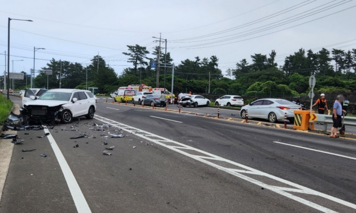 이날 오후 5시 13분쯤 제주시 구좌읍 월정리의 한 도로에서 승용차와 스포츠유틸리티차(SUV) 등 차량 6대가 부딪히는 사고가 발생했다. 제주소방안전본부 제공