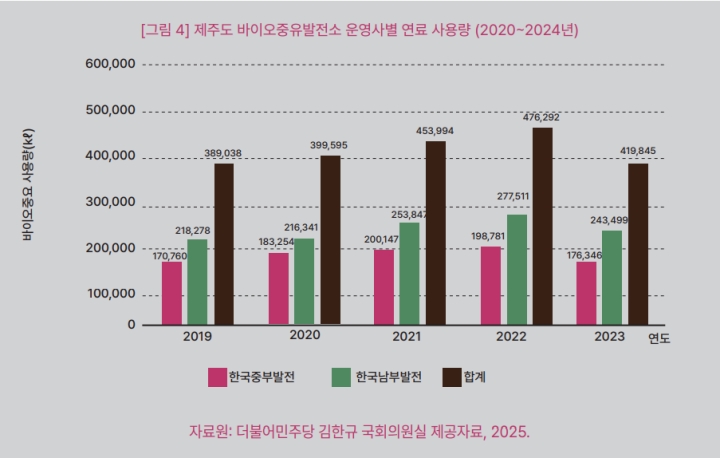 이들 단체는 전세계에서 제주가 유일하게 팜유를 원료 기반으로 삼은 ‘바이오중유’ 발전소를 운영하고 있다고 설명했다. 2023년 바이오중유 사용량은 41만9845㎘이다. 지난해 기준 도내 화력발전소 전체 에너지 생산량 중 바이오중유 사용 에너지는 약 47%로 추정된다. 이 과정에서 발생한 온실가스 배출량은 최근 3년간 ▷2022년 4508t ▷2023년 3953t ▷2024년 4361t이다.