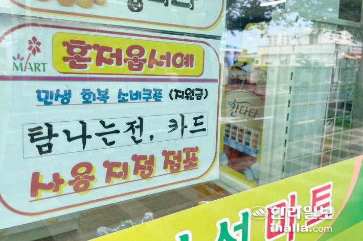 21일 오전 제주시 삼도1동의 한 식료품 매장 앞에 '민생회복 소비쿠폰 사용 지점 점포' 안내문이 부착됐다.