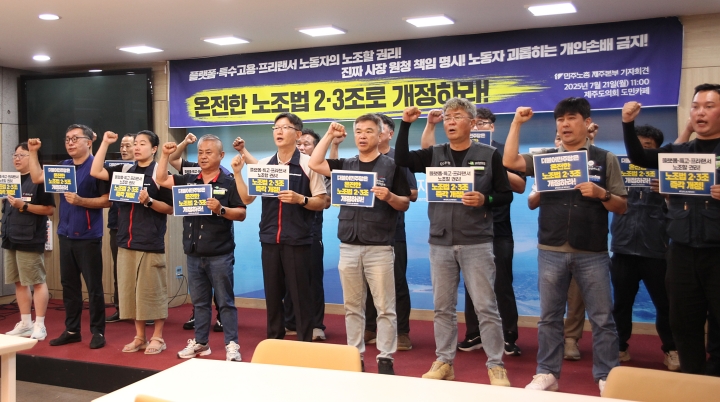 민주노총 제주본부는 21일 오전 제주도의회 도민카페에서 기자회견을 열고 “노조법 2·3조를 온전하게 즉각 개정하라”고 요구했다.