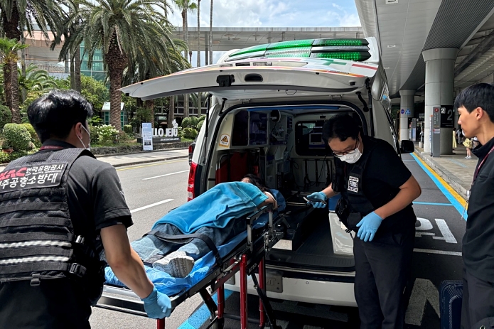 제주자치경찰이 지난 18일 제주공항에서 쓰러진 여성 관광객을 119구급대로 옮기고 있다. 제주자치경찰단 제공