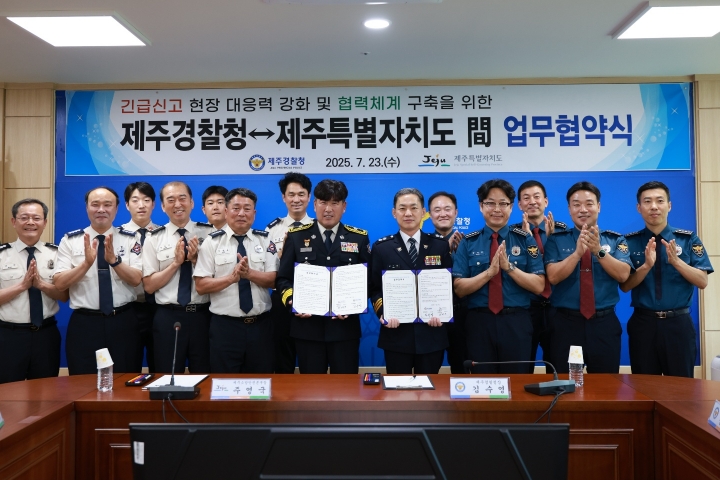 제주경찰청과 제주특별자치도 소방안전본부는 23일 제주경찰청 5층 한라상방에서 긴급신고 골든타임 확보 등 협업체계 구축을 위한 업무협약식을 개최했다. 제주경찰청 제공
