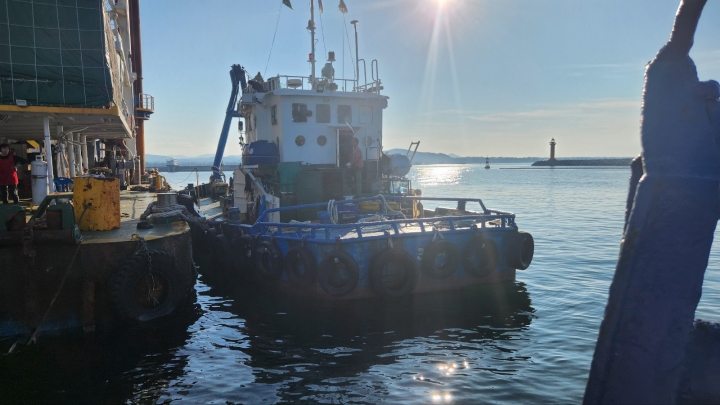 23일 오후 5시48분쯤 서귀포시 성산항에 정박한 A호(바지선, 45t)에서 폭발 사고가 발생해 60대 남성이 크게 다쳤다. 제주소방안전본부 제공