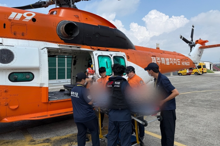 119특수대응단 소속 119항공대는 지난 14일 긴급 폐 이식 수술을 앞둔 폐섬유증 환자를 제주대학교병원에서 수도권의 모 병원으로 이송했다. 제주소방안전본부 제공