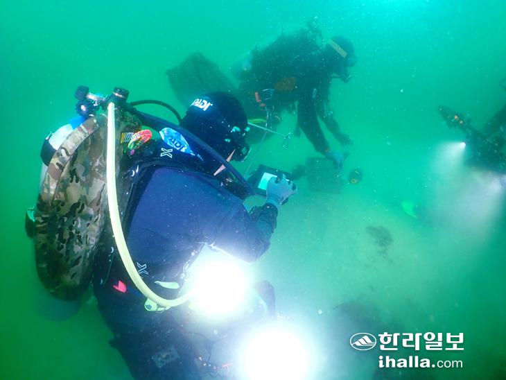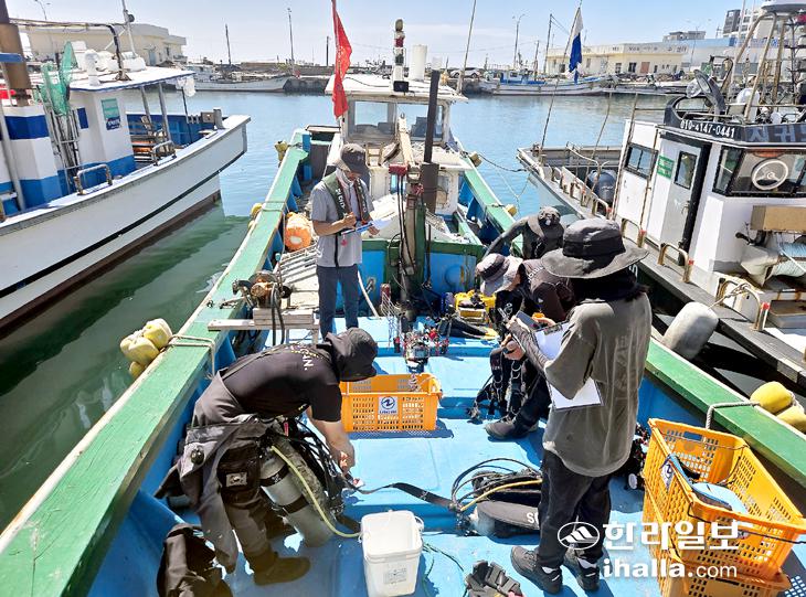 이날 오후 3시, 모슬포항에서 출발한 조사선은 동쪽 해상으로 10여 분을 달려 동일리 앞바다에 도착했다. 잔잔한 바다 위에서 조사선이 멈추자 탐사팀은 곧장 장비 점검에 들어갔다. 스쿠버 다이빙 슈트를 착용하고, 공기통과 레귤레이터, 수중카메라 등 장비를 하나하나 확인하며 탐사 준비를 마쳤다.