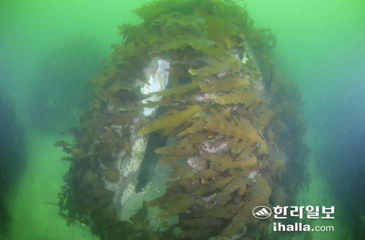 수심 약 18~19m 지점, 해저에 이르자 모래 바닥이 펼쳐졌고, 그 위로 인공어초가 모습을 드러냈다. 양쪽으로 둥글게 곡선을 그린 시멘트 구조물 위에는 미역과 감태가 다발처럼 엉켜 있었다. 물살이 흐를 때마다 해조류 잎이 유영하듯 일렁였다. 탐사팀은 수중카메라로 어초 구조물의 표면을 촬영하고, 어초 틈 사이의 생물 서식 상태를 확인했다.