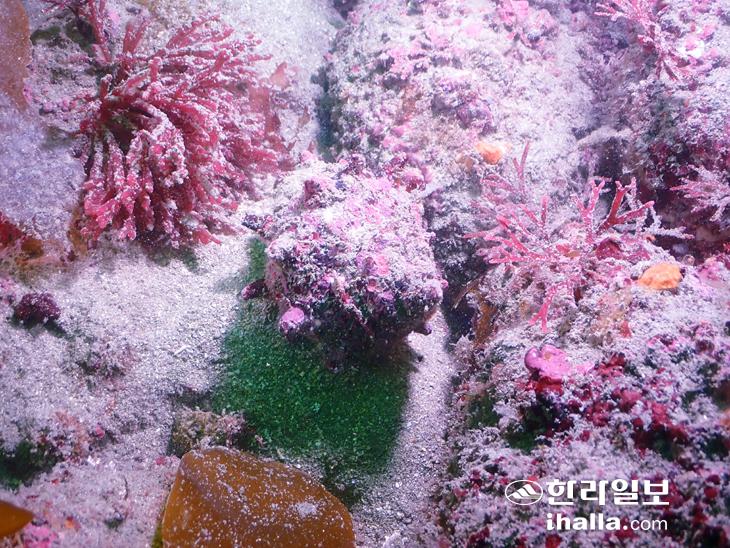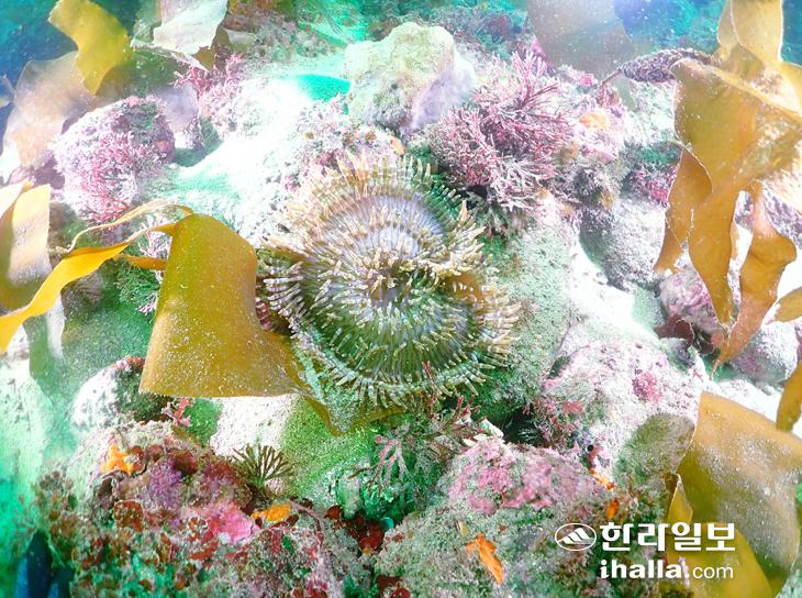 어초 주변 암반에는 유절·무절 석회조류가 하얗게 덮여 있었고, 그 사이사이에는 자연 번식한 감태와 미역이 돋아나 있었다. 따녹색열말미잘은 암반 위에서 우산처럼 펼쳐져 촉수를 꿈틀거리며 먹이를 포착하고 있었다.