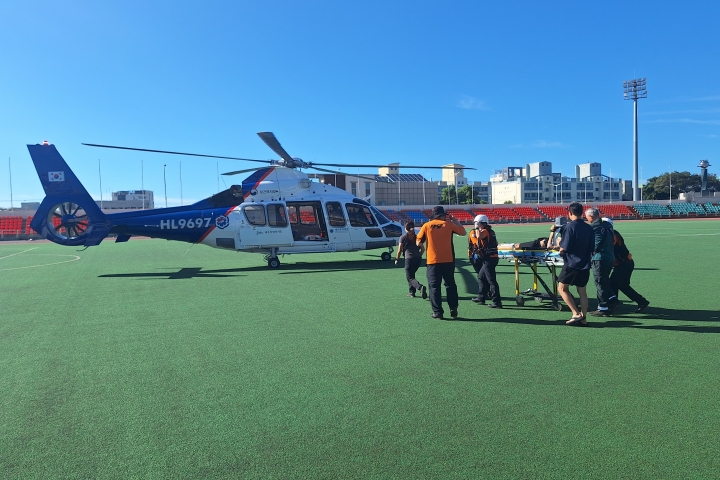 26일 오후 4시 15분쯤 제주시 한림읍 월령리 월령포구에서 물놀이를 하던 20대 남성이 병원으로 이송되고 있다. 제주소방안전본부 제공