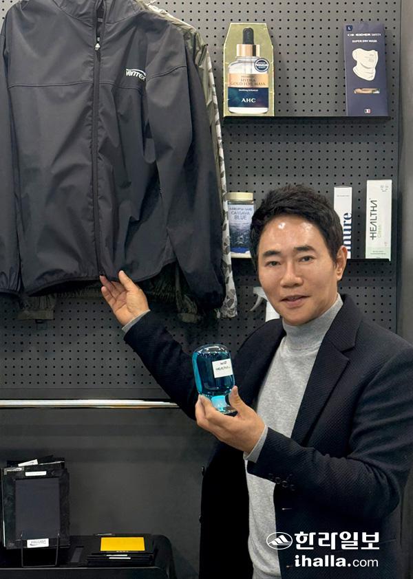 고경찬 벤텍스 대표가 자신이 일군 회사의 수많은 제품 앞에 서있다.