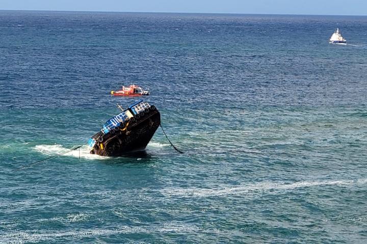 이날 오전 6시 50분쯤 서귀포시 토평동 거믄여해안 남측 해상에서 바지선 A호(236t, 49인승) 90도로 세워져 있다는 신고가 접수됐다. 제주소방안전본부 제공