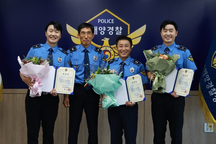 왼쪽부터 이상민, 박상춘 제주지방해양경찰청장, 김병만, 이상호. 제주해양경찰청 제공
