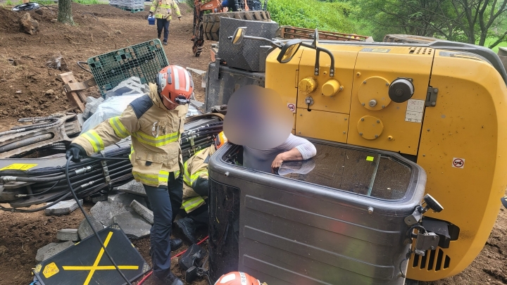 7일 오전 8시쯤 제주시 아라2동의 한 공사현장에서 굴착기가 쓰러지면서 50대 남성이 하반신이 깔렸다. 제주소방안전본부 제공