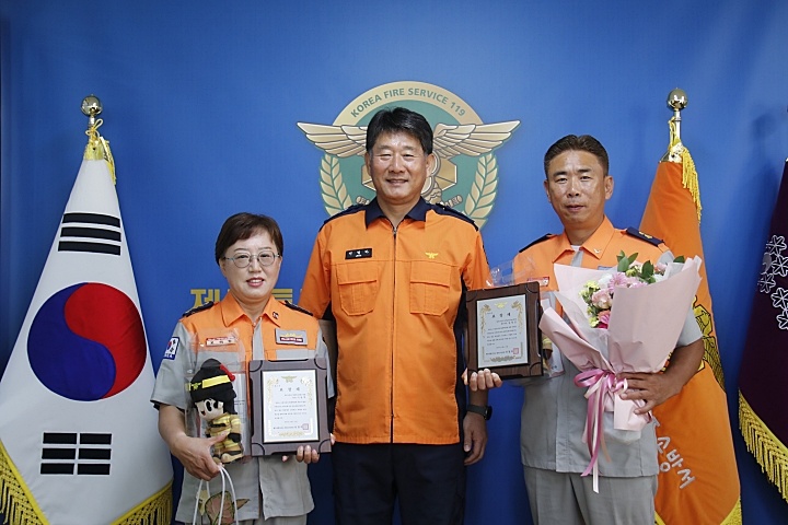 제주소방서는 직할 의용소방대원 이윤희(왼쪽)씨와 동부소방서 신촌의용소방대원 김영진씨에게 소방서장 표창을 수여했다. 제주소방서 제공