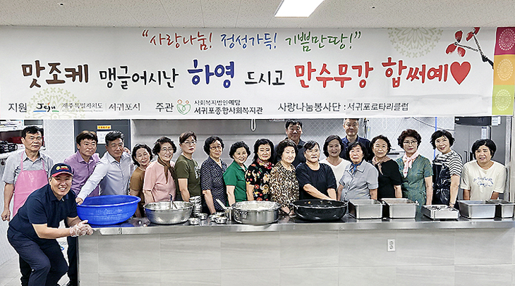 서귀포로타리클럽(회장 강성종)은 20일 서귀포종합사회복지관 경로식당을 방문해 300여 명을 대상으로 급식 봉사활동을 펼쳤다. 노인급식 봉사활동 참여를 희망하는 단체는 서귀포종합사회복지관으로 문의하면 된다.