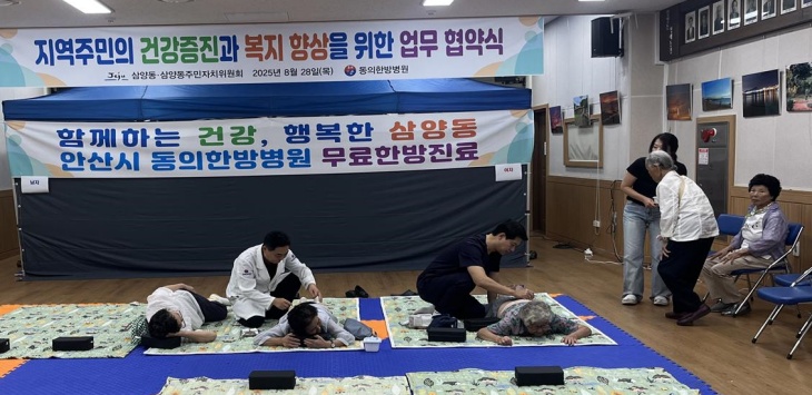 경기 안산 소재 동의한방병원 의료진이 28~29일 양일간 삼양동주민센터에서 지역 주민들을 위한 무료 한방진료를 진행하고 있다. 제주시 삼양동 제공
