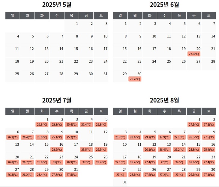 서귀포 월별 열대야 발생 캘린더. 기상청 자료 캡쳐
