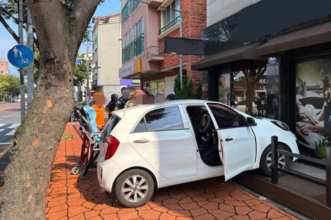 2일 오전 9시 41분쯤 제주시 노형동에서 한 경차가 인도를 넘어 상가로 돌진했다는 신고가 접수됐다. 제주소방안전본부 제공
