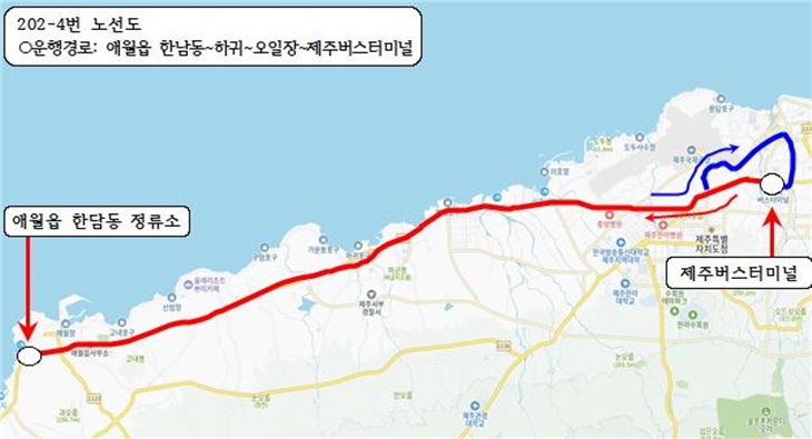 이번 수요 맞춤형 버스 투입으로 202-4번은 애월읍 한담동과 제주버스터미널 구간을 하루 왕복 4회 운행한다.