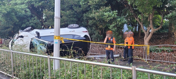 4일 오전 6시 37분쯤 제주시 노형동 제주제일고등학교 사거리 인근 인도 위에서 차량 전도 사고가 발생했다. 제주소방안전본부 제공