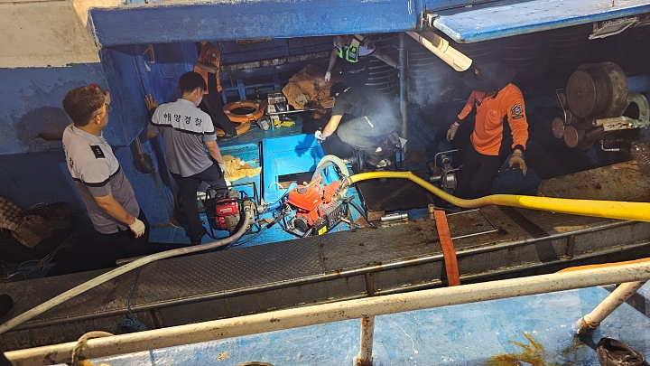 4일 새벽 4시 30분쯤 서귀포항에서 어선 A호가 좌현으로 40도 기울어지는 사고가 나 해경이 배수조치에 나섰다. 서귀포해양경찰서 제공