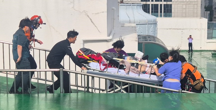 한라산을 오르던 60대 관광객이 심정지 상태로 소방헬기로 제주시내 병원으로 긴급 이송됐다. 제주도 소방안전본부 제공