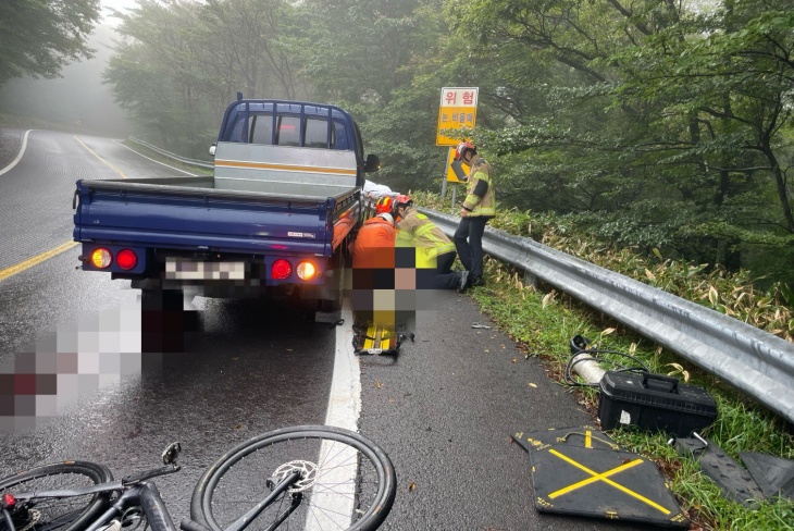10일 오전 8시40분쯤 한라산 어리목코스 입구 약 1.5㎞ 지점 1100도로 상에서 트럭과 자전거가 충돌, 이 사고로 자전거 운전자가 중상을 입어 병원으로 긴급 이송됐다. 제주소방안전본부 제공