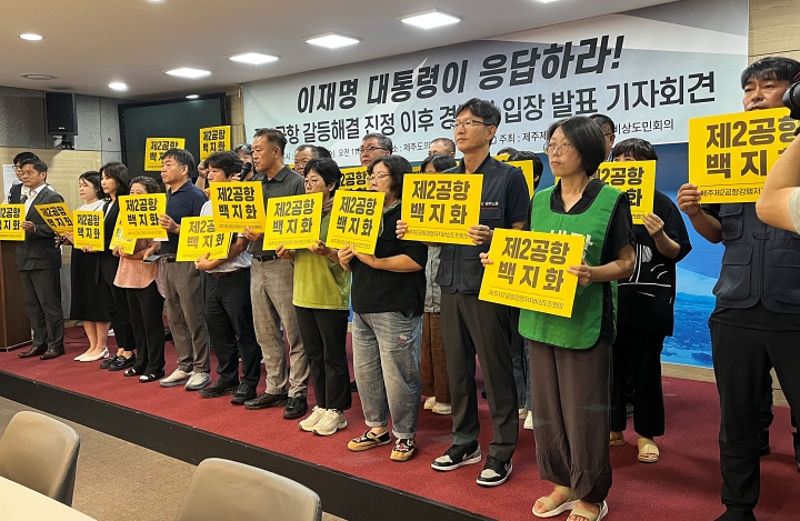 제주제2공항강행저지비상도민회의는 10일 오전 제주도의회 도민카페에서 기자회견을 열고 제2공항 갈등 해결을 위한 이재명 정부의 적극적인 행동을 촉구했다.