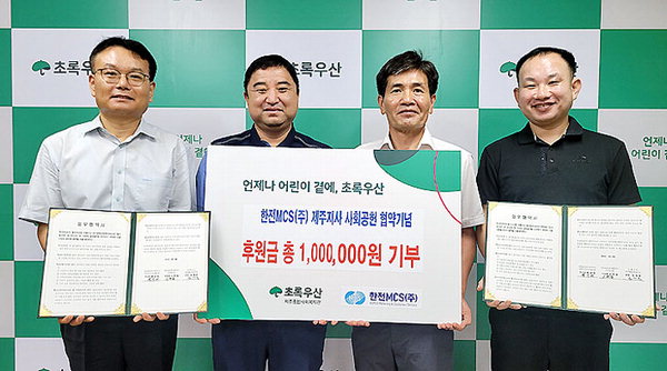 [한라일보] 초록우산 제주종합사회복지관(관장 김재춘)은 한전MCS(주) 제주지사 제주지사직할지점(지사장 황성태), 한전MCS(주) 제주지사 서귀포지점(지점장 고현철)과 지난 8일 복지관에서 아동복지향상 및 나눔문화 확산을 위한 업무협약 체결과 후원금 전달식을 진행했다.