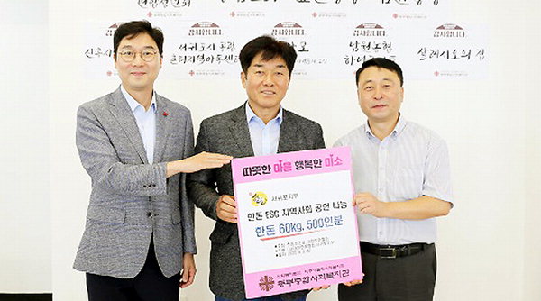 이번 물품은 한돈 ESG지역사회 사회공헌 나눔 행사의 일환으로 기탁한 것으로, 동부종합사회복지관(관장 오명복) 및 봉사자들을 통해 어르신들의 식사로 제공될 예정이다.