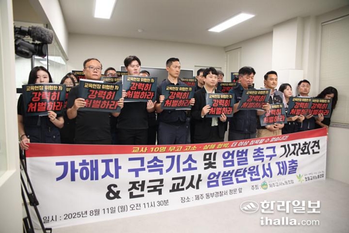 제주교사노동조합은 지난달 11일 제주시 교사노동조합 사무실에서 학부모 A씨에 대한 엄벌 탄원 촉구 기자회견을 열었다.