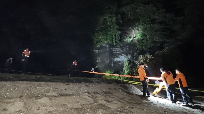지난 15일 오후 서귀포시 성산읍 성산일출봉에서 암반과 나무가 낙하해 소방이 안전조치에 나섰다. 제주소방안전본부 제공
