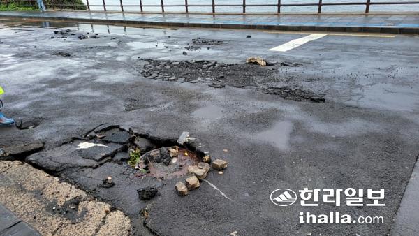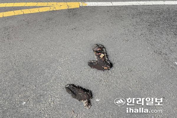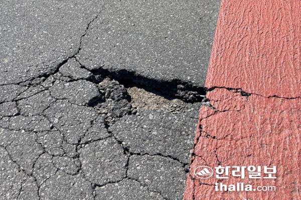 [한라일보] 제주도내 곳곳에서 발생하는 포트홀(도로 파손으로 생긴 움푹 파인 구멍)이 운전자들의 안전을 위협하고 있다. 또 최근 기후위기 등으로 예측 불가능한 소나기가 자주 발생하면서 노후화된 도로 위 포트홀 발생에 대한 우려가 커지고 있다.